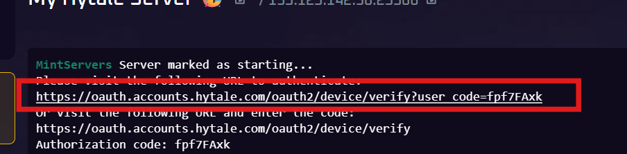 The first time you start your Hytale server, you'll see a special message appear with a link and a code. This is completely normal - it's asking you to verify your server.