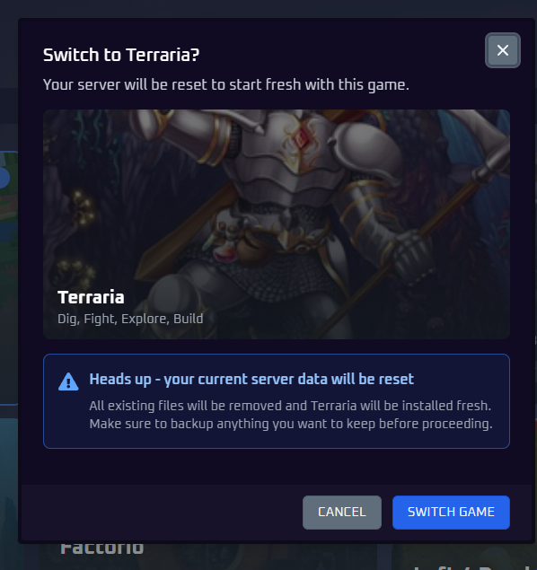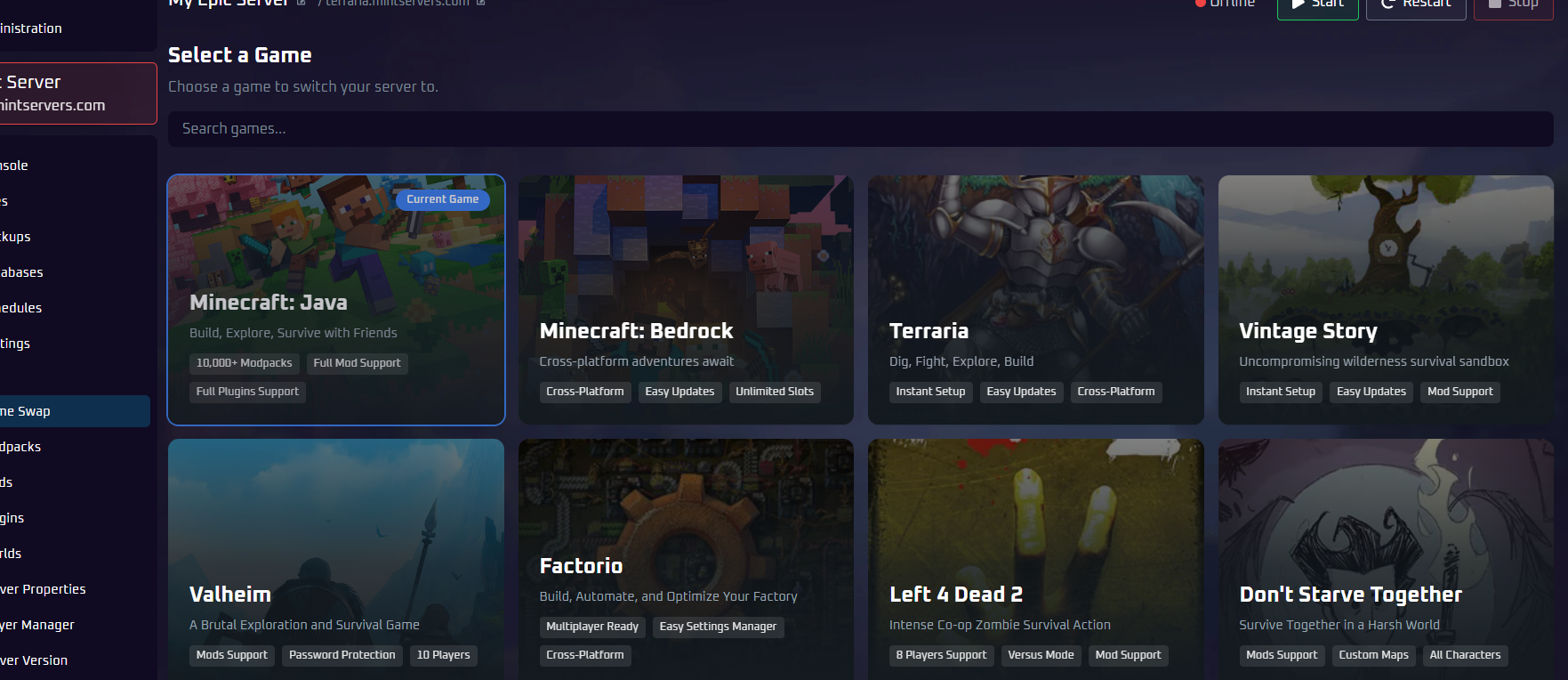 Game Swap allows you to easily switch between different games on your server. This powerful feature gives you the flexibility to explore new games or switch between your favorite titles whenever you want. .