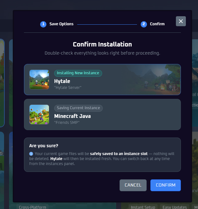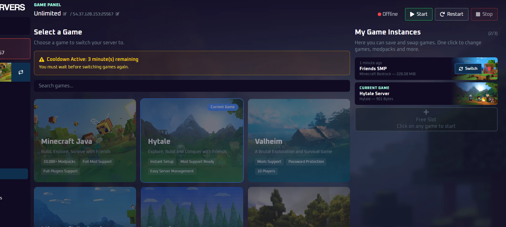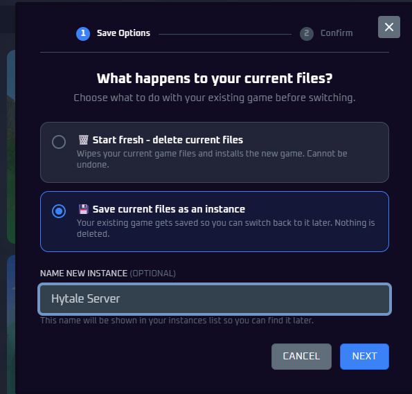 Game Instances let you save multiple games on one server and switch between them instantly - no data loss, no reinstalling. Think of each instance as a saved slot for a different game, modpack, or world.